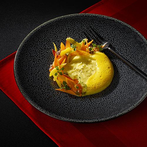 - Dans une casserole, réduisez le jus de carotte de moitié, ajoutez le lait et 25 g de beurre puis émulsionnez à l’aide d’un mixeur plongeant